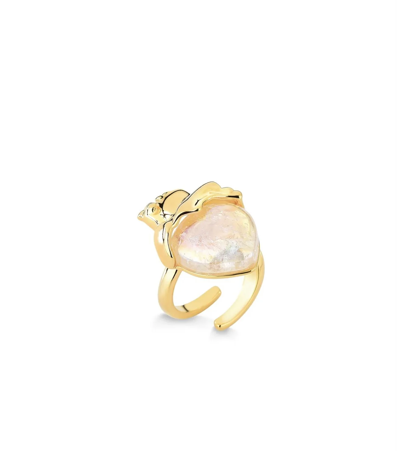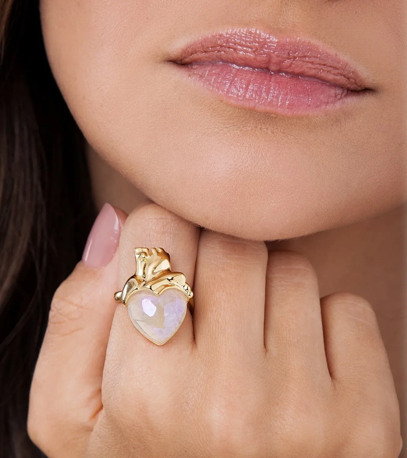 The highlight is the anatomical heart at the top, with its delicate metallic lines that mimic arteries, surrounding the holographic white quartz stone. This construction transmits the vibrant energy of the stone, symbolizing love in its purest and most intense form.