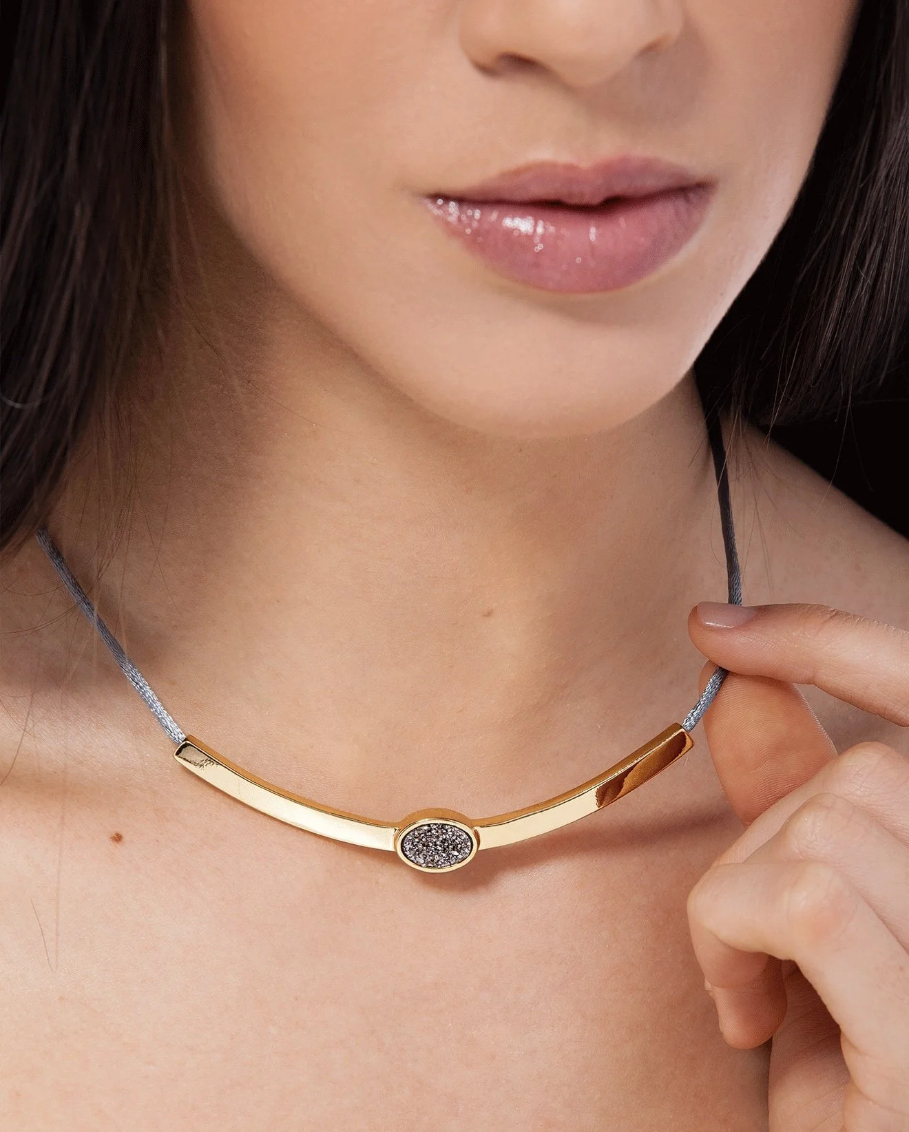 At the front, the necklace showcases a robust metallic element with clean lines and a polished finish, adding strength and structure to the design. In the center, an oval-shaped cabochon-cut metallic druzy stone adds shine, texture, and depth, creating the perfect focal point between the metal and the cord.