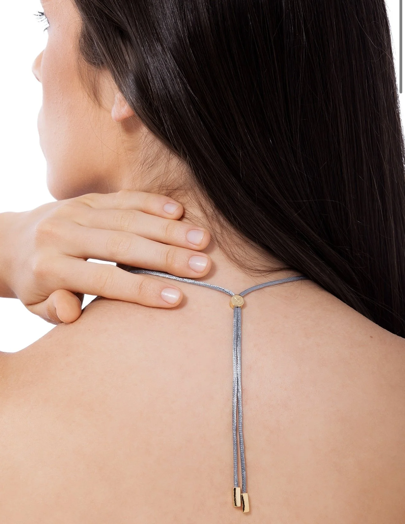 The Maria Dolores Contour Necklace combines power and simplicity in a design that balances craftsmanship and contemporary style. The medium-length necklace, crafted from gray silk cord, embodies the lightness of the fabric with the striking presence of gold-plated metal, creating an elegant and personality-filled contrast.